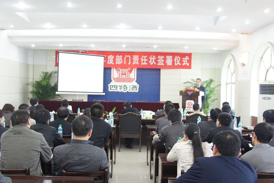 3月27日上午10時,四特酒2012年部門責任狀簽署儀式在公司含弘樓9樓多功能會議廳舉行。廖昶董事長與各副總出席簽署儀式,共同見證了24位部門負責人簽署部門2012年度目標責任狀。