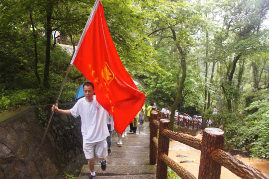6月7日上午8點半,所有參賽團隊到達閣皂山山門口,但由于比賽現場突然下起傾盆大雨,市體育局決定將比賽延期。但幸運的是,上午9點天氣又突然雨轉多云,于是四特伙伴們決定繼續攀登閣皂山!四特伙伴們統一穿著印有“求真務實 從容久遠”的企業文化衫,在廠旗的帶領下,一同向閣皂山主峰進發。整個團隊也立刻成為閣皂山一道靚麗的風景。