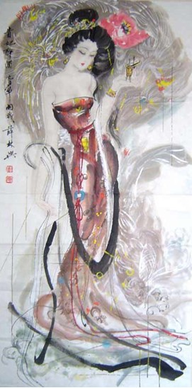 卻說這天傍晚,皇宮院內涼風習習,皓月當空。唐玄宗與楊貴妃本來相約在百花亭品酒賞花,屆時玄宗卻沒有赴約,而是移駕到西宮與梅妃共度良宵。良辰美景奈何天,雖然景色撩人欲醉,楊貴妃也只好在花前月下悶悶獨飲,喝了一會不覺沉醉,邊飲邊舞,嘴里念叨著"李二郎你枉為人君,說話不算數......"萬般春情,此時竟難自排遣,加以酒入愁腸,立時便醉。一時春情萌動不能自持,竟至忘乎所以,面對高力士等一干太監宮女,楊貴妃頻頻作出種種求歡猥褻狀,倦極才怏怏回宮。